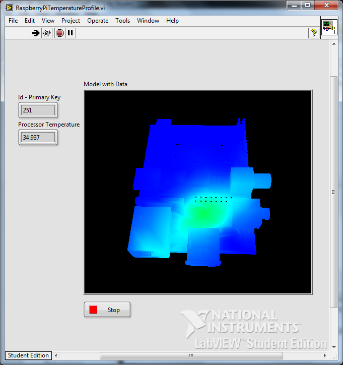 Every 100ms I query the database, build an array with the temperature data and then apply it to the Sensor Mapping Express VI. The temperature profile then changes according to the surface temperature of the RasPi.